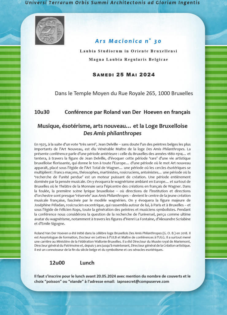Ars Macionica - Samedi 25 Mai 2024 : Conférence publique par Roland van Der Hoeven en français: Musique, ésotérisme, arts nouveau… et la Loge Bruxelloise Des Amis philanthropes