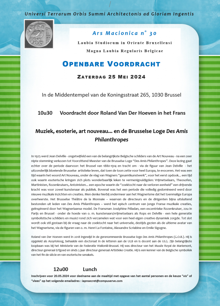 In 1925 werd Jean Delville - ongetwijfeld een van de belangrijkste Belgische schilders van de Art Nouveau - na een zeer nipte stemming verkozen tot Voorzittend Meester van de Brusselse Loge “Des Amis Philanthropes”. Deze lezing gaat echter over de periode daarvoor: het Brussel van 1880-1914 en tracht om - via de figuur van Jean Delville - het uitzonderlijk bloeiende Brusselse artistieke leven, dat toen de toon zette voor heel Europa, te evoceren. Het was een tijd waarin het woord Art Nouveau, onder de vlag van Wagners “gesamtkunstwerk”, voor het eerst opdook... een tijd ook waarin esoterische kringen zich plots wonderbaarlijk leken te vermenigvuldigden: Vrijmetselaars, Theosofen, Martinisten, Rozenkruisers, Antoinisten... een epoche waarin de “zoektocht naar de verloren eenheid” een drijvende kracht was voor zowel kunstenaar als publiek. Bovenal was het een periode die volledig gedomineerd werd door nieuwe muzikale inzichten en creaties. Men denke hierbij ondermeer aan het Wagnerisme dat het toenmalige Europa overheerste. Het Brusselse Théâtre de la Monnaie – waarvan de directeurs en de dirigenten bijna uitsluitend bestonden uit leden van Des Amis Philanthropes – werd het episch centrum van jonge Franse muzikale creaties, geïnspireerd door het Wagneriaanse model. De Fransman Joséphine Péladan, een excentrieke Rozenkruiser, zou in Parijs en Brussel - onder de hoede van o. m. kunstenaars/vrijmetselaars als Rops en Delville - een hele generatie symbolistische schilders en musici rond zich verzamelen wat voor een heel eigen creative dynamiek zorgde. Tot slot wordt ook stil gestaan bij de vraag naar de zoektocht naar het universele, destijds gezien als de ultieme avatar van het Wagnerisme, via de figuren van o. m. Henri La Fontaine, Alexandre Scriabine en Emile Sigogne.